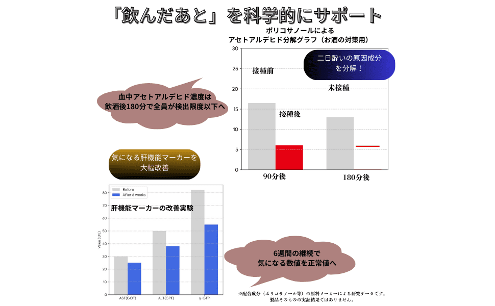 飲酒後180分でアセトアルデヒドをND(検出限界以下)まで導くスピード分解に着目 。翌朝のどんよりをリセットし、軽やかな朝を叶えます。